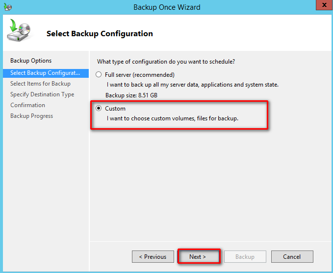 Selanjutnya adalah memilih backup nya, disini memilih apa saja yang akan dbackup, dan pada lab ini saya memberikan full server. full server ini , jadi semua file yang di server akan dibackup.
